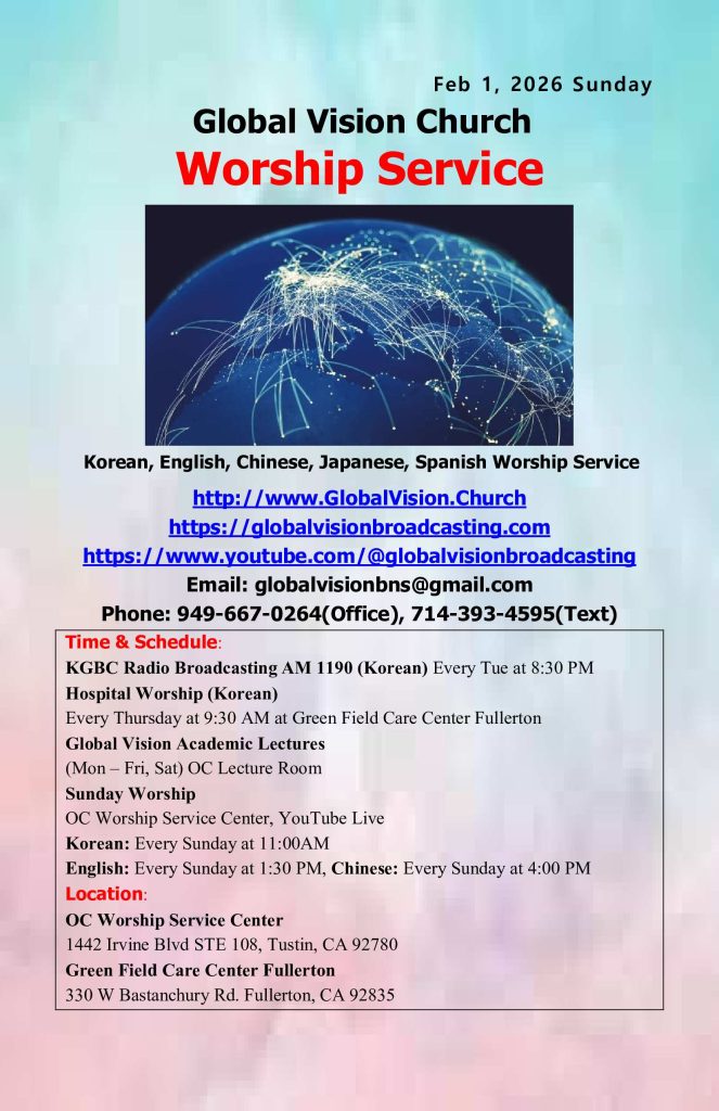 3. Global Vision Church Radio Broadcasting on AM 1190 KGBC (Korean Gospel Broadcasting) every Tuesday at 8:30 PM. We encourage you to listen and help spread the word.
