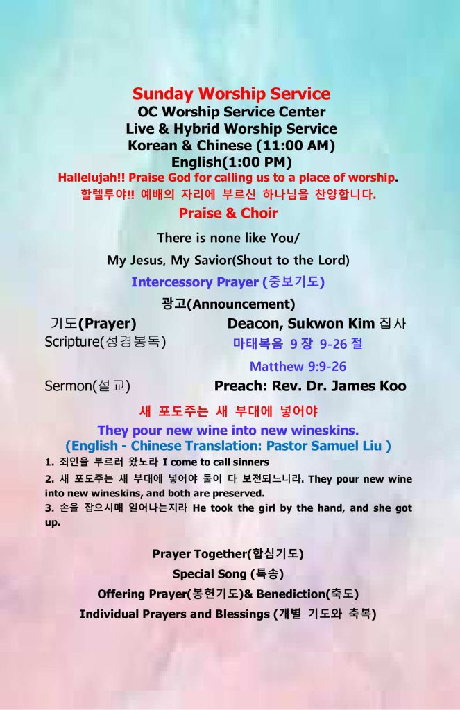 2. 매주일 현장 예배시간이 오전 11시 영어 및 중국어 동시 통역예배로 진행됩니다. 예배후 친교의 시간이 있습니다.