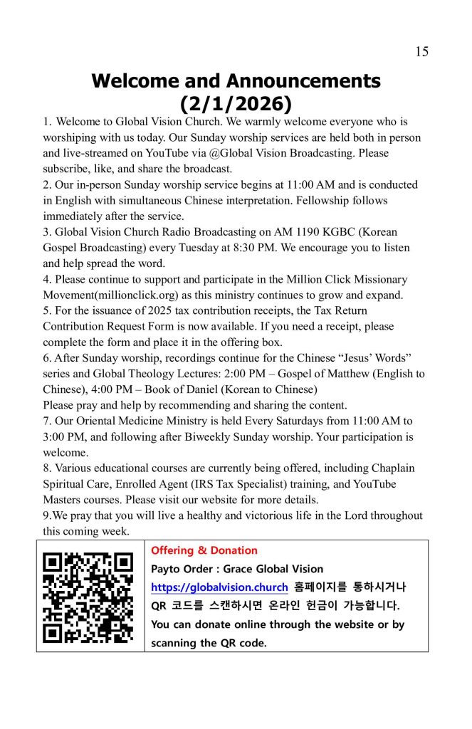 1. Welcome to Global Vision Church. We warmly welcome everyone who is worshiping with us today. Our Sunday worship services are held both in person and live-streamed on YouTube via @Global Vision Broadcasting. Please subscribe, like, and share the broadcast.