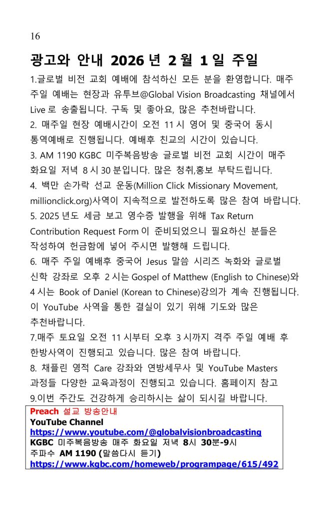 | Preach 설교 방송안내 YouTube Channel https://www.youtube.com/@globalvisionbroadcasting KGBC 미주복음방송 매주 화요일 저녁 8시 30분-9시 주파수 AM 1190 (말씀다시 듣기) https://www.kgbc.com/homeweb/programpage/615/492 |