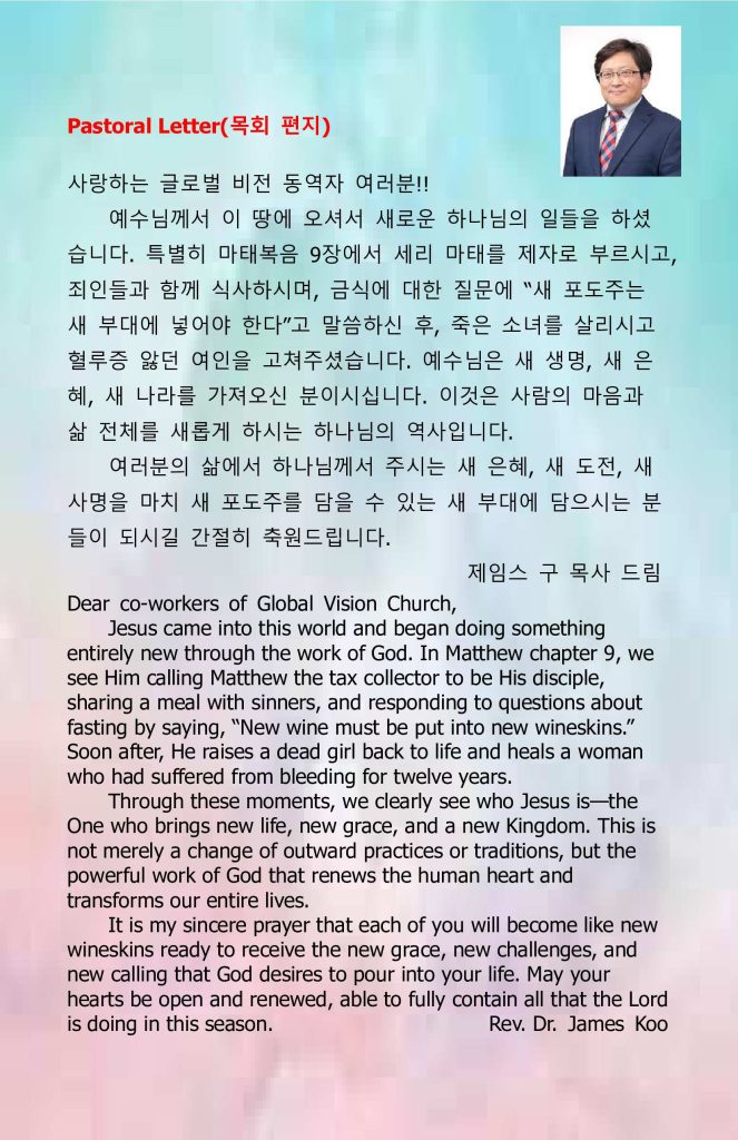 5. 2025년도 세금 보고 영수증 발행을 위해 Tax Return Contribution Request Form이 준비되었으니 필요하신 분들은 작성하여 헌금함에 넣어 주시면 발행해 드립니다.