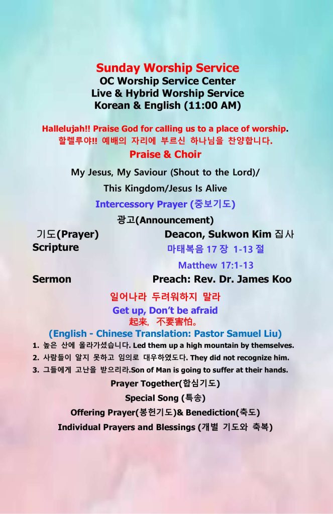 - Every Sunday 11:00 AM worship service is conducted with simultaneous interpretation. After the service, there will be a time of fellowship, and we kindly encourage everyone to stay and participate.