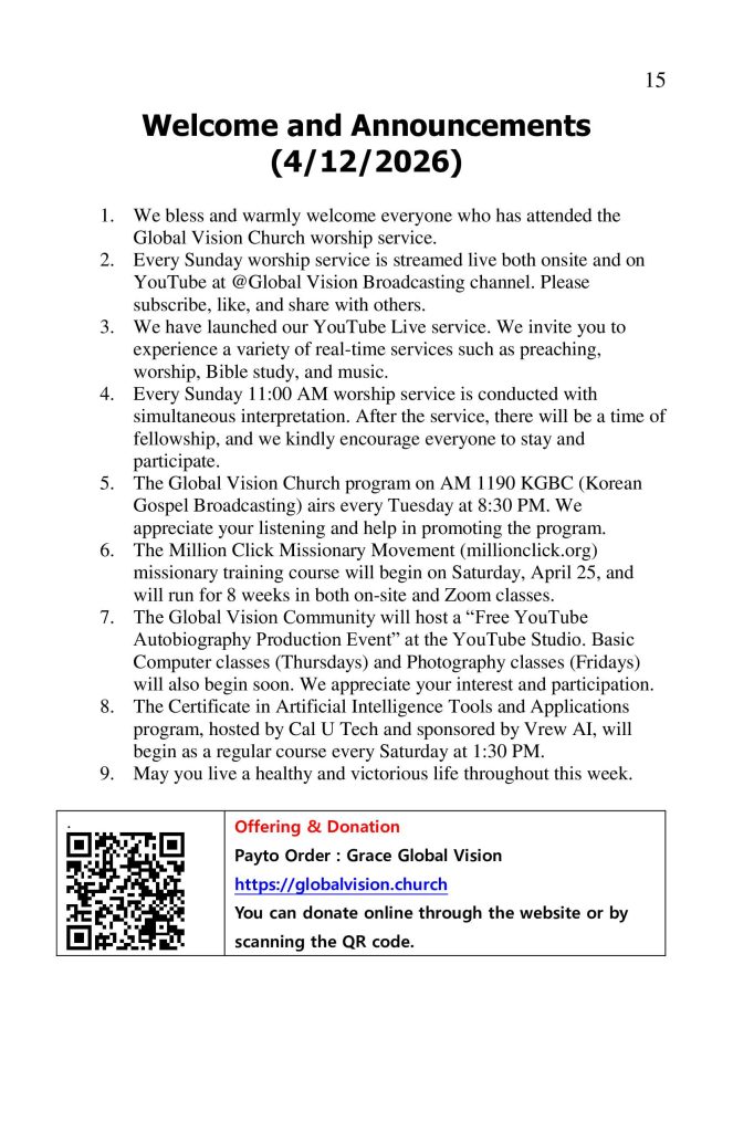 1. .글로벌 비전 교회 예배에 참석하신 모든 분을 축복하고 환영합니다.