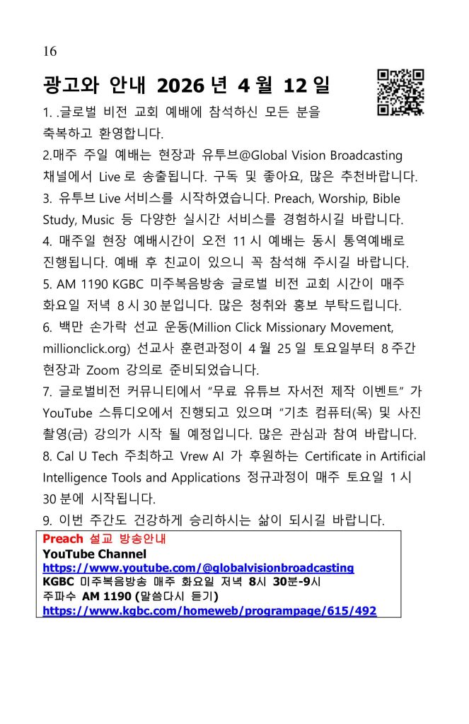 | Preach 설교 방송안내 YouTube Channel https://www.youtube.com/@globalvisionbroadcasting KGBC 미주복음방송 매주 화요일 저녁 8시 30분-9시 주파수 AM 1190 (말씀다시 듣기) https://www.kgbc.com/homeweb/programpage/615/492 |