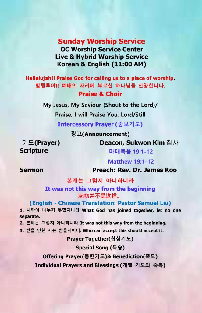 4. 매주일 현장 예배시간이 오전 11시 예배는 동시 통역예배로 진행됩니다. 예배 후 친교이 있으니 꼭 참석해 주시길 바랍니다.