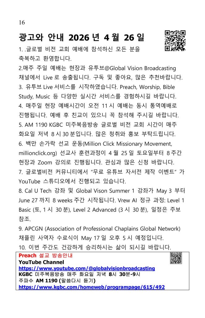 https://www.youtube.com/@globalvisionbroadcasting KGBC 미주복음방송 매주 화요일 저녁 8 30-9 주파수 AM 1190 (말씀다시 듣기) https://www.kgbc.com/homeweb/programpage/615/492